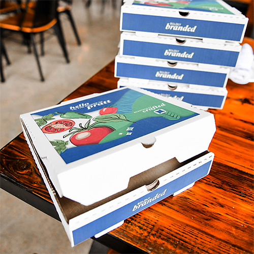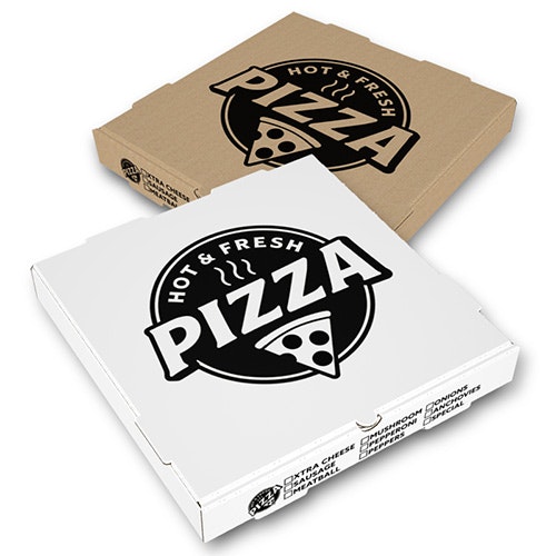 Choose from mottled white or kraft corrugated cardboard for your pizza box base, then add that professional touch that leaves a lasting impression.